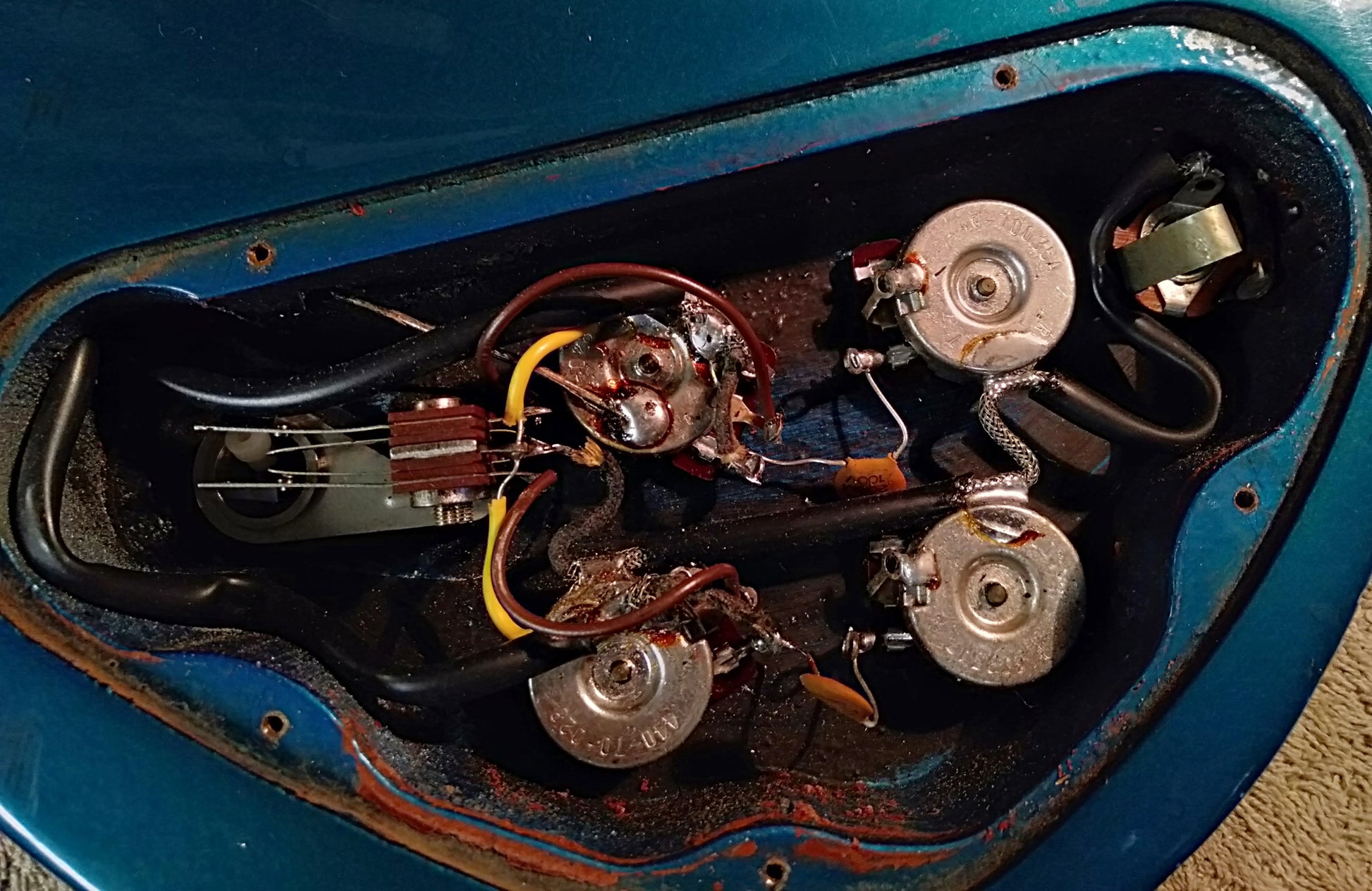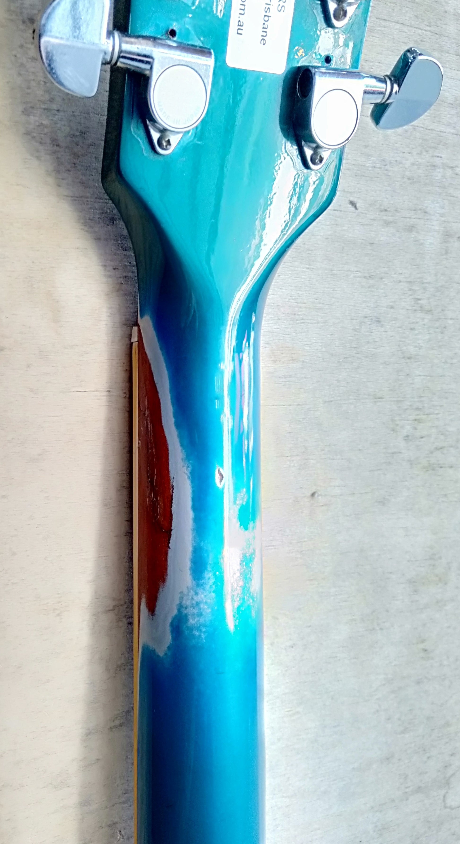 MI USA. Good condition with player wear, chips and scratches. Original rare metallic blue nitro finish has gone beautifully green in places. Lots of wear on back of neck and some on elbow cutaway. Set neck with bound and inlaid rosewood fretboard. Original 490 humbucker pickups. Original pots date 17th week 1993. Original bridge and tailpiece. Missing 2 reflectors from original knobs. Tuners replaced with sealed gear Gotoh tuners. No breaks or repairs. With hardcase.