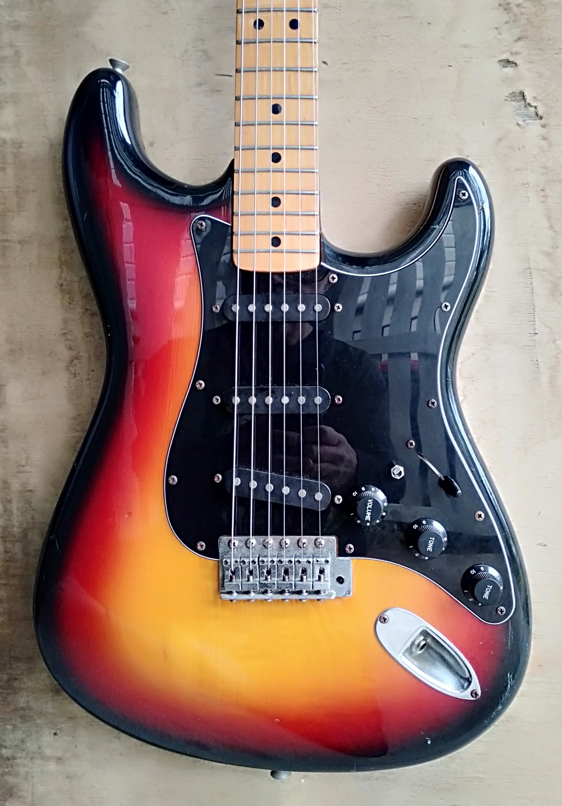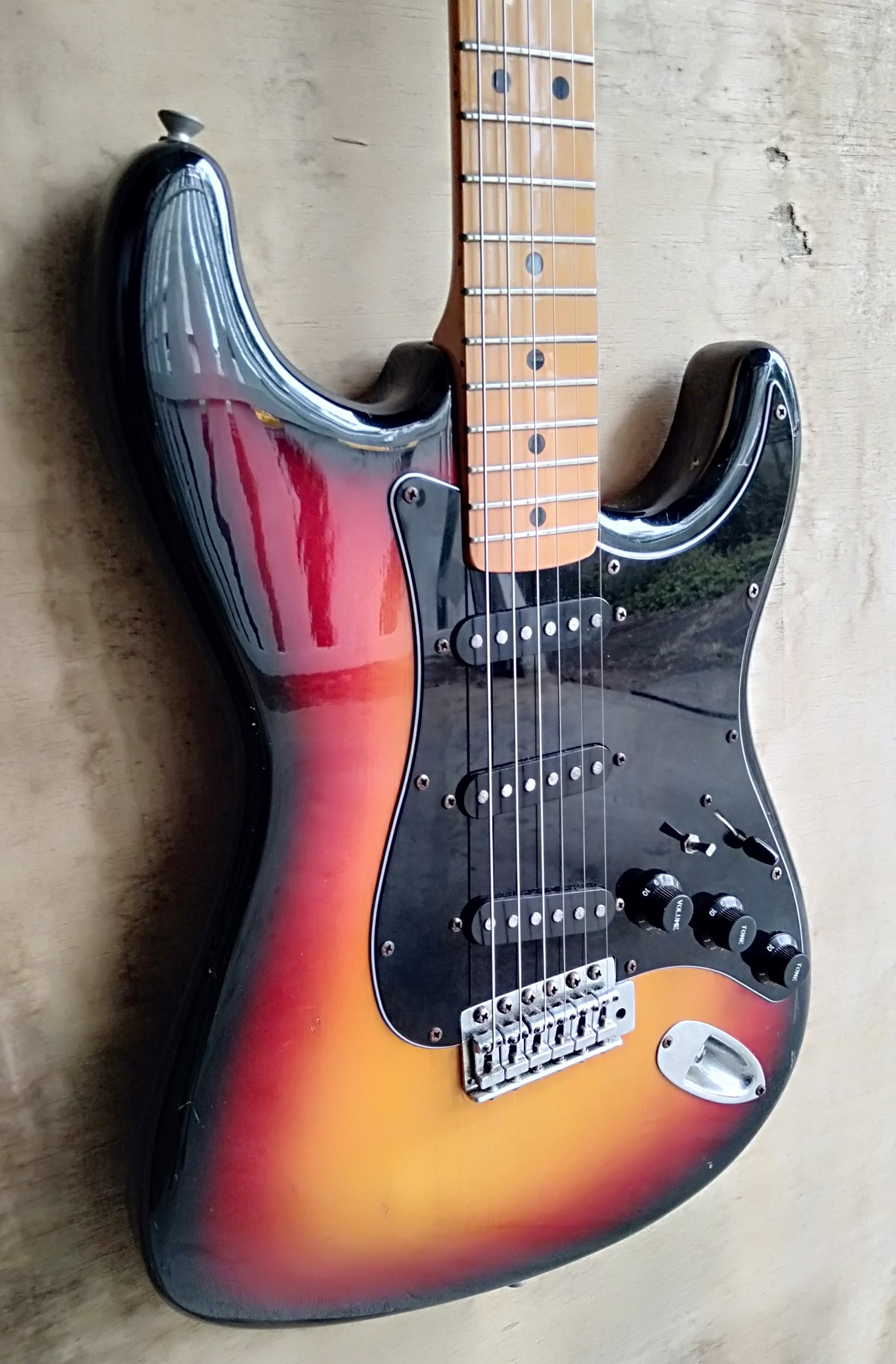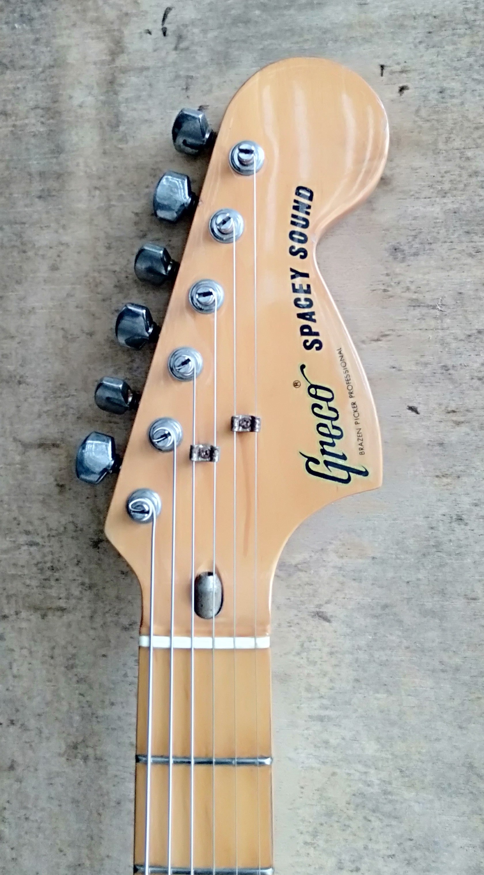 MIJ. Good condition with player wear, chips and scratches. Made in the Fujigen factory. Solid ash body with maple-on-maple neck. Original (very sought after) Maxon "31276" alnico pickups. Early 70's re-issue big headstock and 3 bolt neck. Bullet truss rod at headstock. Original Greco branded sealed gear tuners. 5-way pickup switch. Non original scratchplate with kill switch and pull pot on volume.  A great Strat from the time just before these became Fender Japan.