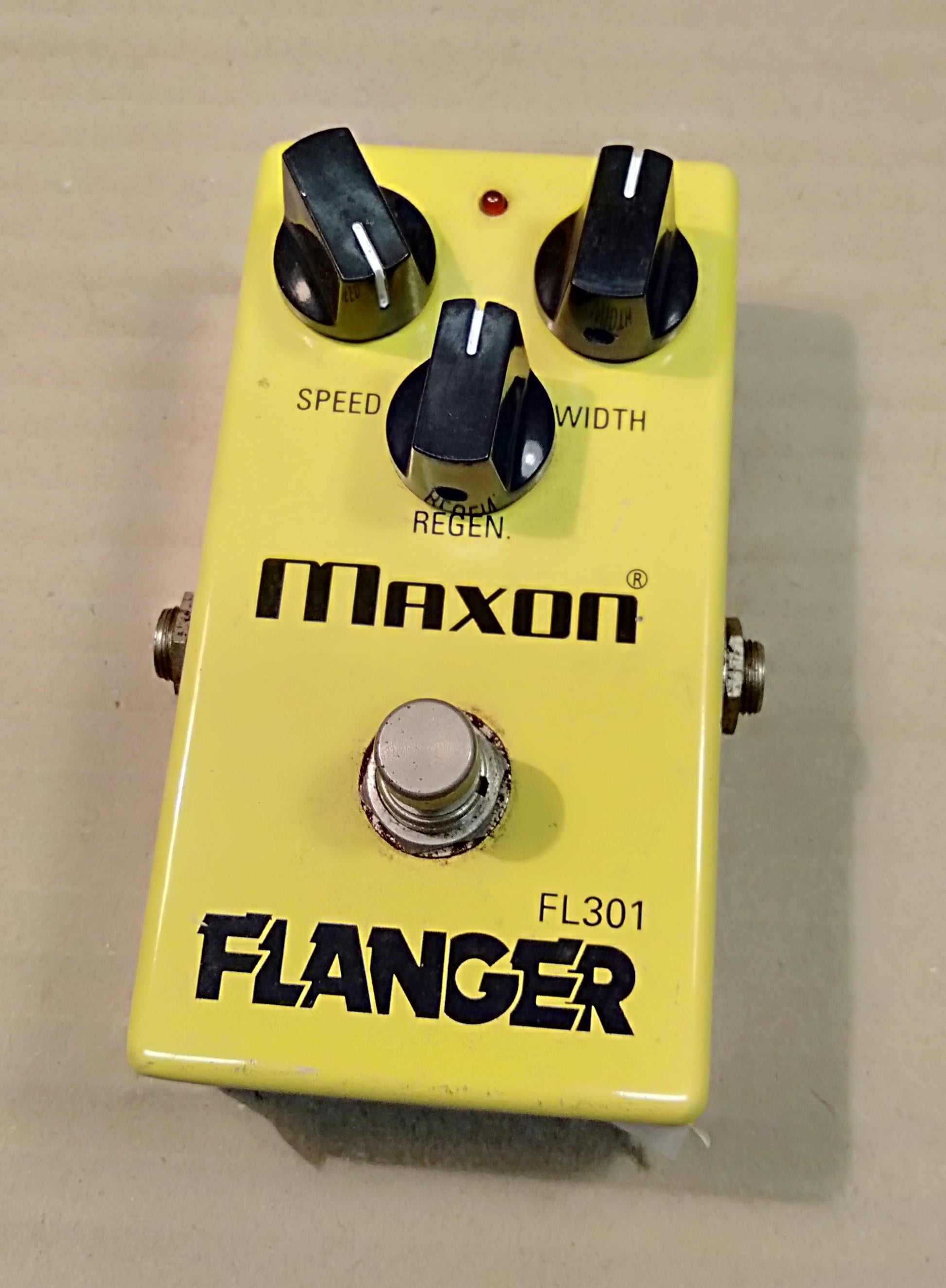 The yellow FL301 Flanger produces the wide-sweeping vibrato and jet-like effects characteristic of the 70's analog boxes. One of the downsides of flangers is that many of them can add noise to the signal, and some are noisier than others are. The FL301 isn't as noisy or tinny sounding as 70's flanging effects where you do hear the sweep in the background, but it's tolerable. The FL301's controls include Speed, Width, and Regeneration. The effect has a delay time of 1 to 12.8 milliseconds and a speed frequency range of .06 to 13 Hz to construct an assortment of usable sounds from slow and subtle sweeps to one with fast and intense vibrato.