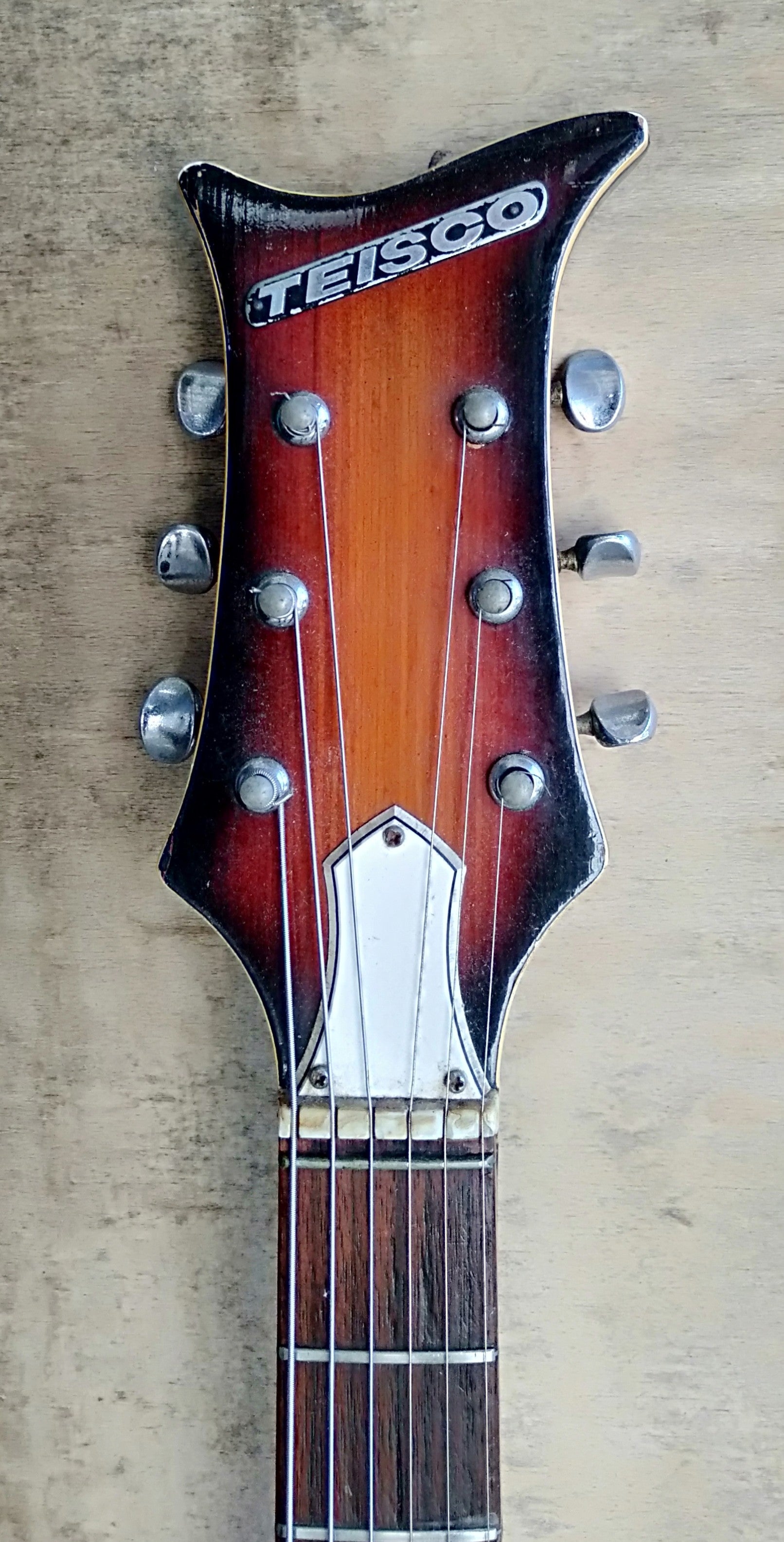 All original electronics including 2 hi output Teisco blade pickups with 3-way switch with master volume and tone. Branded scratchplate. Great sunburst finish. No case.